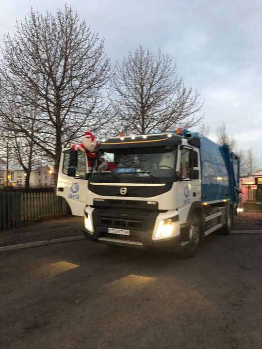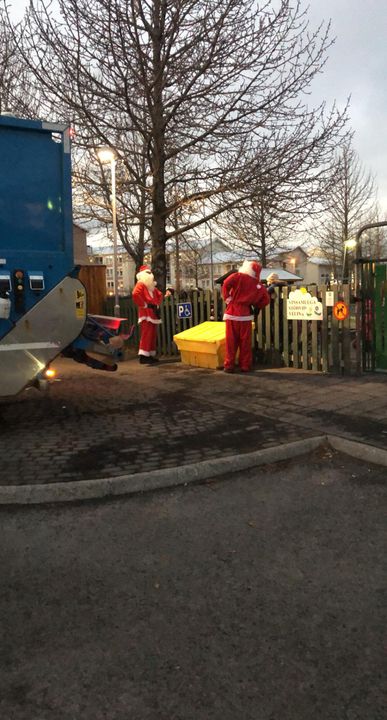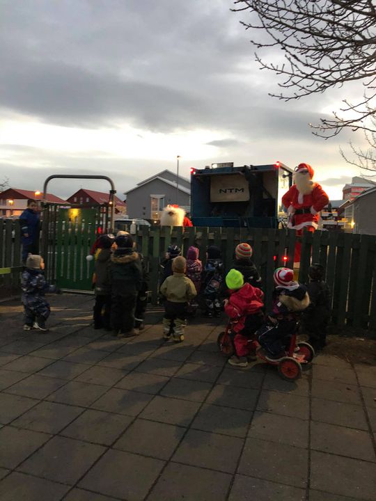 Börnin í Stóra Læk urðu hissa í dag þegar ruslabíllinn mætti flautandi á bílaplanið. Með í för voru kátir sveinar sem spjölluðu við börnin og tæmdu síðan tunnurnar og héldu leið sinni áfram.